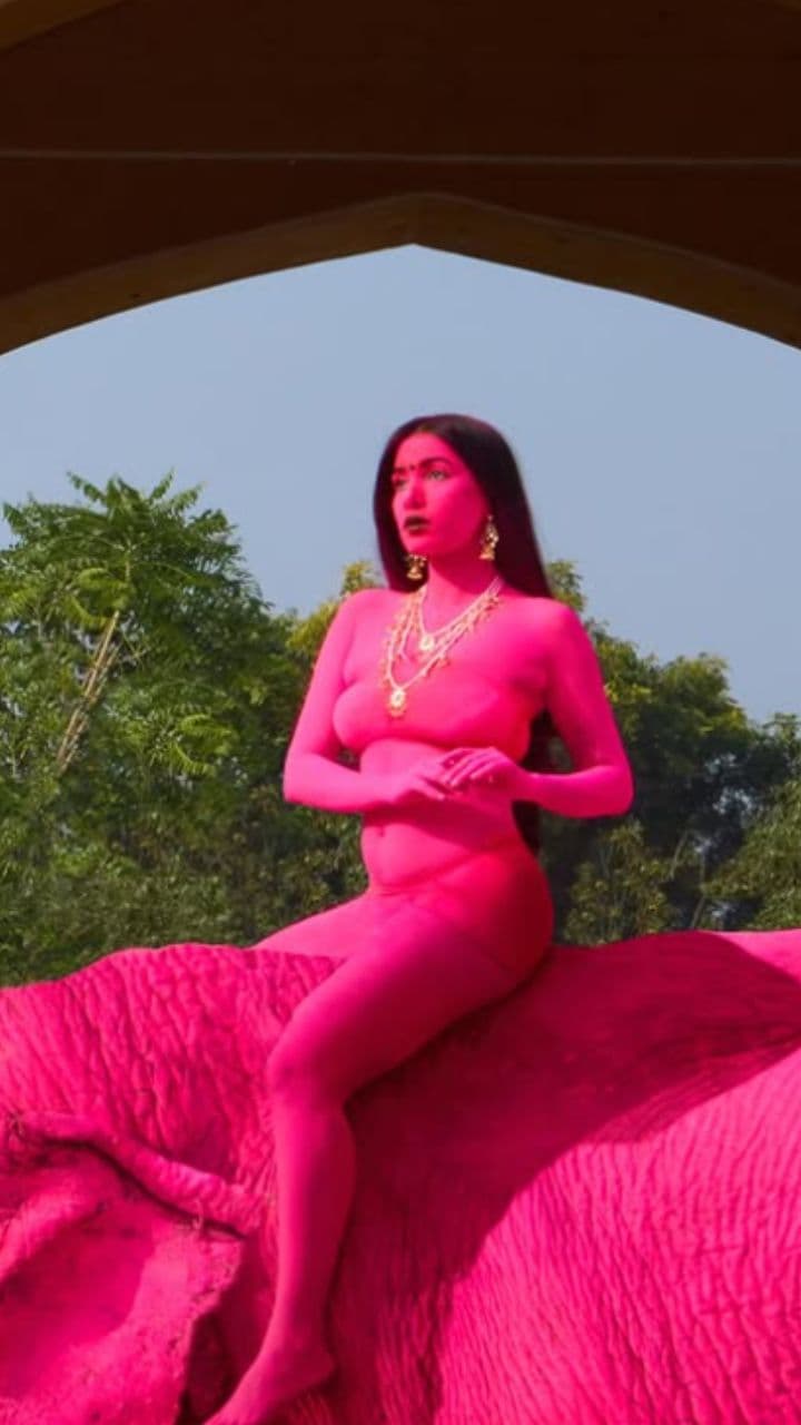 The model gave such bold poses in bikini after painting the elephant pink, it created a ruckus. Foreign Model Julia Buruleva Bold Photoshoot With Painted Pink Elephant In Jaipur