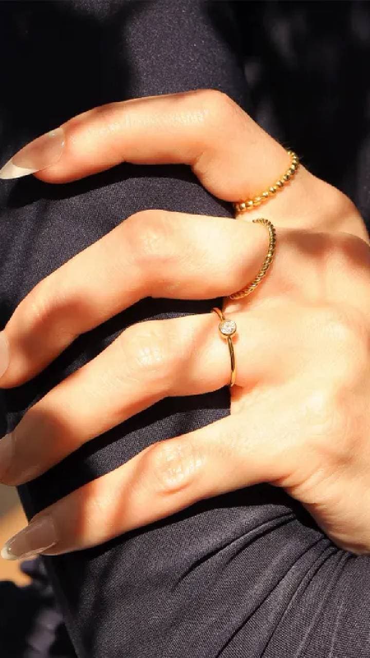 If you want a simple yet elegant design, then a mini solitaire style gold ring is the best option. The small stone on the thin gold band makes it perfect for daily wear.