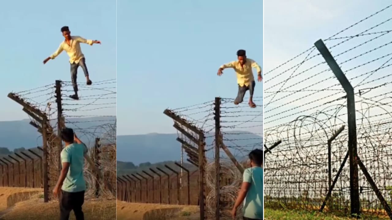It is being said that this video is from near the fenced border of India-Bangladesh. In the video, a young man coming from Bangladesh side climbs the barbed wire fence. A person standing on the Indian side is making a video of that young man. The young man climbs up and poses in film style and then jumps over the fence into India. The video shows the fenced India-Bangladesh border, where no security forces are present. It is reported that only two people are at the entire border and they entered inside without any fear.