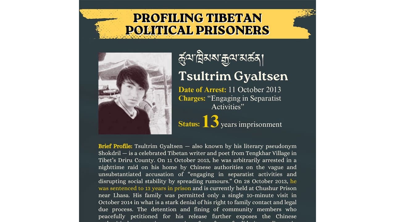 The Central Tibetan Administration highlighted the case of Tibetan writer and political prisoner Tsultrim Gyaltsen, arrested in 2013 and sentenced to 13 years, calling it emblematic of China’s human rights abuses and suppression of dissent in Tibet.