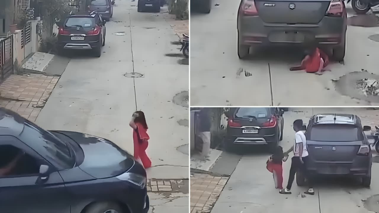 A viral video from Ahmedabad shows a child miraculously surviving after a car ran over her while she was playing. She crawled out safely, leaving viewers shocked. The incident sparked public anger, with many claiming the driver was a minor. The case has raised concerns about road safety, underage driving and parental responsibility.