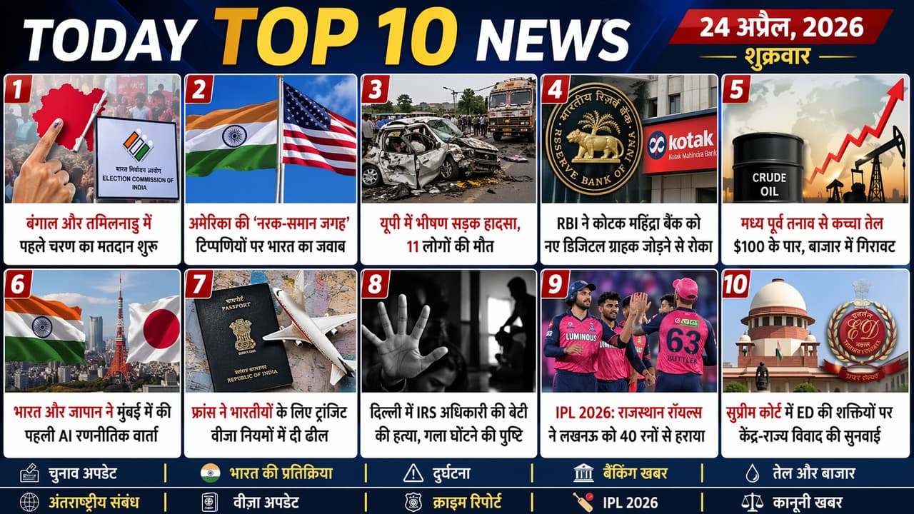 Top 10 News Today: The morning of Friday, April 24, 2026 has revealed many important events in India and the world, where there is a lot of activity in all spheres of politics, economy, diplomacy, law and order and sports. Voting in the first phase of assembly elections in West Bengal and Tamil Nadu has given momentum to the democratic process, while India’s strong reaction to Donald Trump’s controversial remarks has put international diplomacy at the center of attention. A deadly road accident in Uttar Pradesh and a murder incident in New Delhi have raised questions on internal security, while the Reserve Bank of India’s actions and the surge in oil prices due to the Middle East crisis have added to economic concerns. Also, India-Japan AI cooperation, France’s visa relaxation and exciting matches of the Indian Premier League have made this day multifaceted and extremely important.
