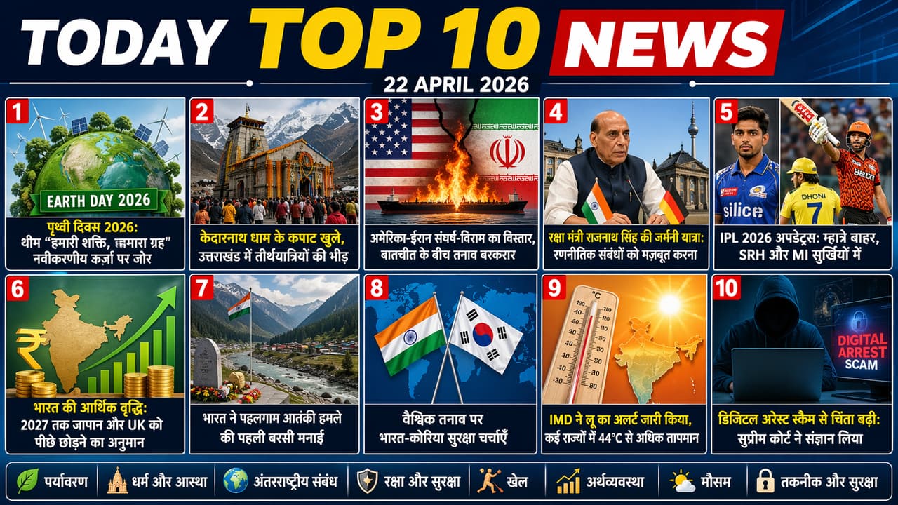 10 Big And Latest News Today: Environment, geopolitics, economy and security take center stage in the global and national news of 22 April 2026. With the theme of Earth Day 2026 being “Our Power, Our Planet”, the emphasis is on renewable energy, while US-Iran tensions and the Strait of Hormuz crisis continue to impact the global economy. The beginning of Kedarnath Yatra in India, IMD’s heat alert, Supreme Court’s cognizance of Digital Arrest Scam and IMF’s economic projections have made the situation in the country and abroad more important.