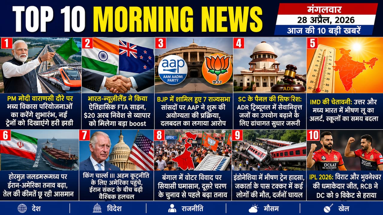 Top 10 Morning News 12 April 2026: The big news of the country and the world on the morning of Tuesday, April 28, 2026 centered around development, politics, international tension and sports. From Narendra Modi’s visit to Varanasi to the increasing tension in the Strait of Hormuz, every news is having a wide impact. At the same time, the heatwave warning of the India Meteorological (IMD) Department, the political conflict between the Aam Aadmi Party and the Bharatiya Janata Party, and the brilliant performance of Virat Kohli are in the headlines.