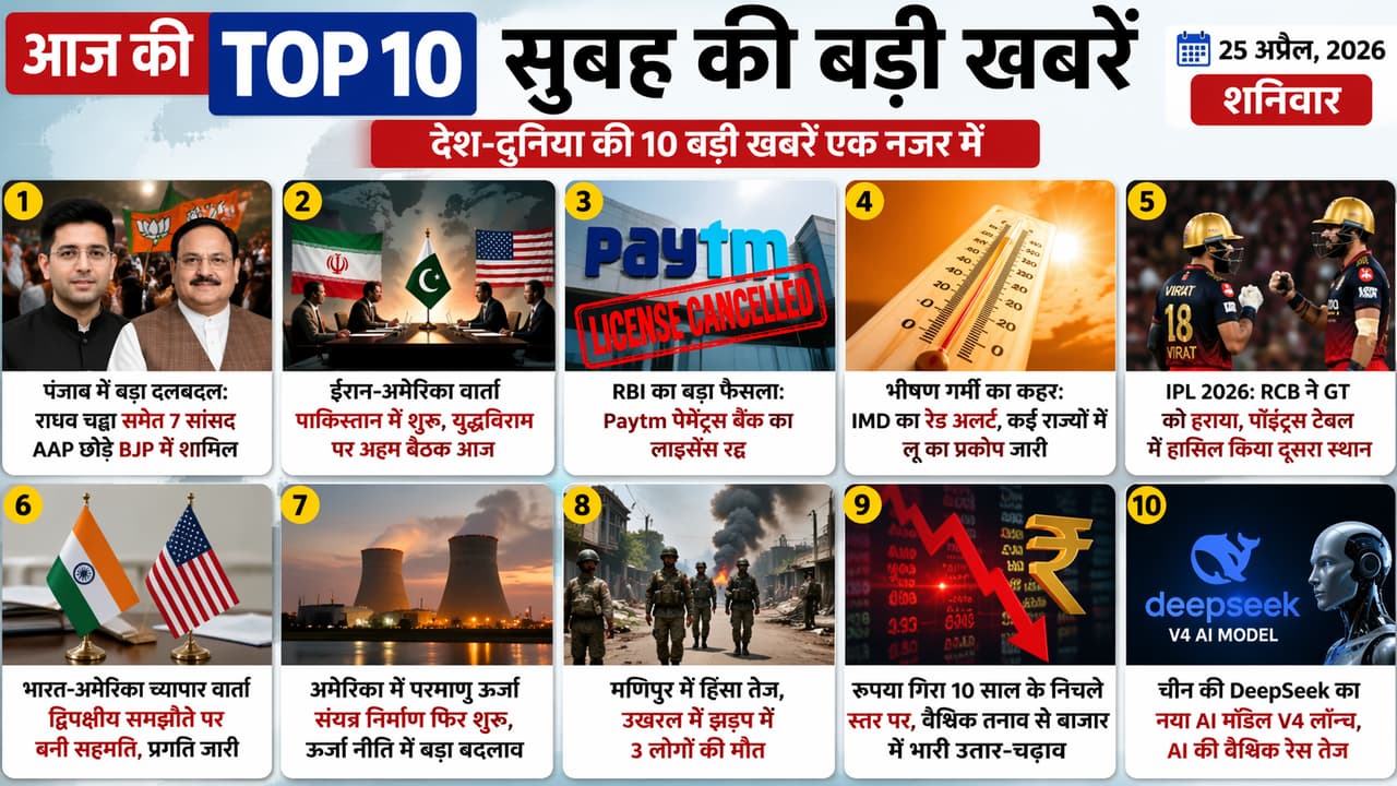 25 April 2026 Top 10 News: Big defection from AAP to BJP in Punjab, Iran-US talks in Pakistan, RBI cancels Paytm bank license, heatwave red alert across the country, RCB victory in IPL 2026, India-US trade agreement progress, Manipur violence, rupee fall, DeepSeek AI launched.