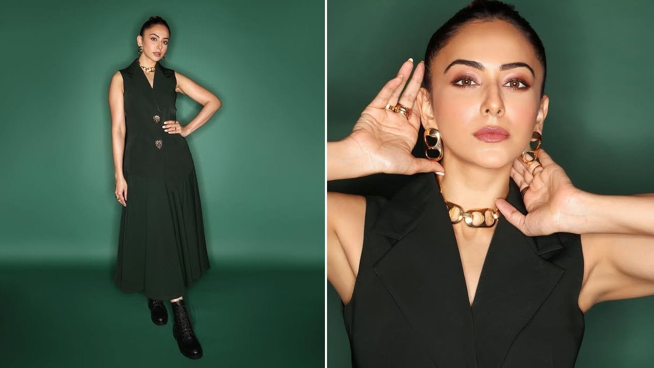 Rakul Preet Singh made a confident style statement at the ZEE Samvad Real Heroes Awards 2026, where she was honoured as Best Actress of the Year for De De Pyaar De 2. She opted for a sleeveless forest green blazer paired with a matching pleated skirt, elevated with gold buttons. Black boots and statement jewellery added edge, while a neat bun kept the look polished. The outfit struck a balance between power dressing and modern femininity, resonating strongly with fashion watchers.