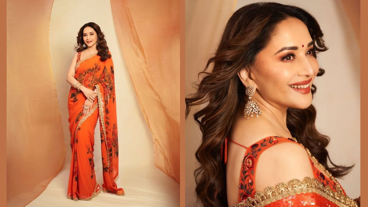 Madhuri Dixit embraced classic grace in an orange saree adorned with oversized rose motifs, dark green leaves and zari embroidery along the border. The floral sleeveless blouse complemented the saree’s vibrant palette beautifully. Traditional statement jewellery and softly styled open waves completed the look. The ensemble stood out for its rich colours and timeless charm, reminding audiences why Madhuri remains an enduring style icon known for blending tradition with effortless elegance.
