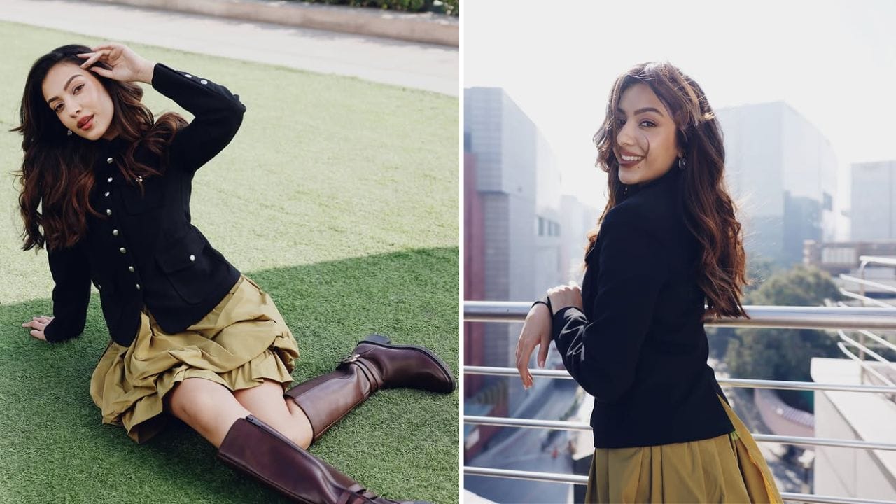 Sahher Bambba showcased contemporary chic in a black mandarin-collar jacket detailed with metallic buttons and functional pockets. She paired it with an olive-hued flowy skirt, creating a strong contrast between structure and softness. Brown high boots added a bold finish, while minimal jewellery and open hair kept the look clean. Her outfit stood out for its modern layering and confident styling, appealing to fashion lovers drawn to experimental yet wearable silhouettes.