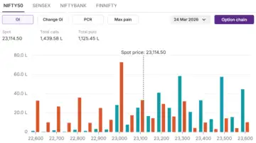 On the open interest front, the 23,800 calls hold the highest open interest, indicating a strong resistance on the upside. The 23,000 puts hold the highest open interest for tomorrow’s expiry, indicating a near-term resistance.