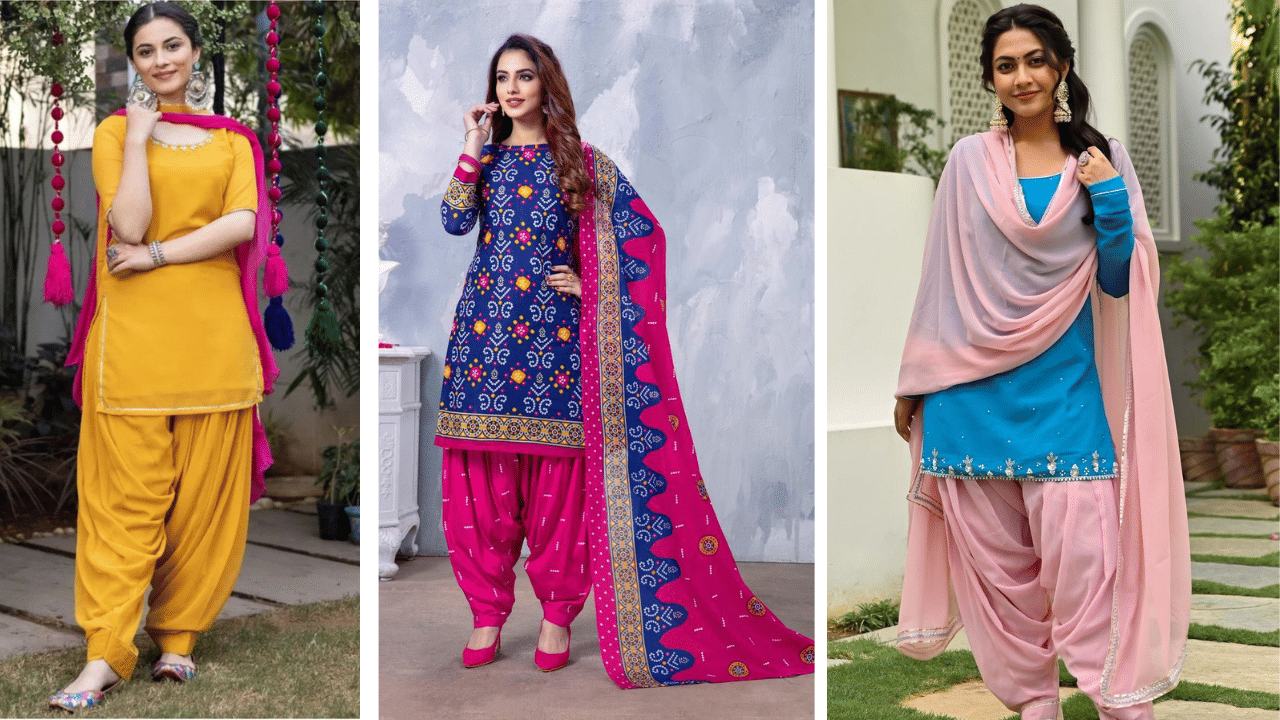 Ideal for daytime celebrations, a cotton Patiala salwar paired with a printed or mirror-work kameez adds comfort and colour. The flowy silhouette allows ease of movement during dance and festivities.