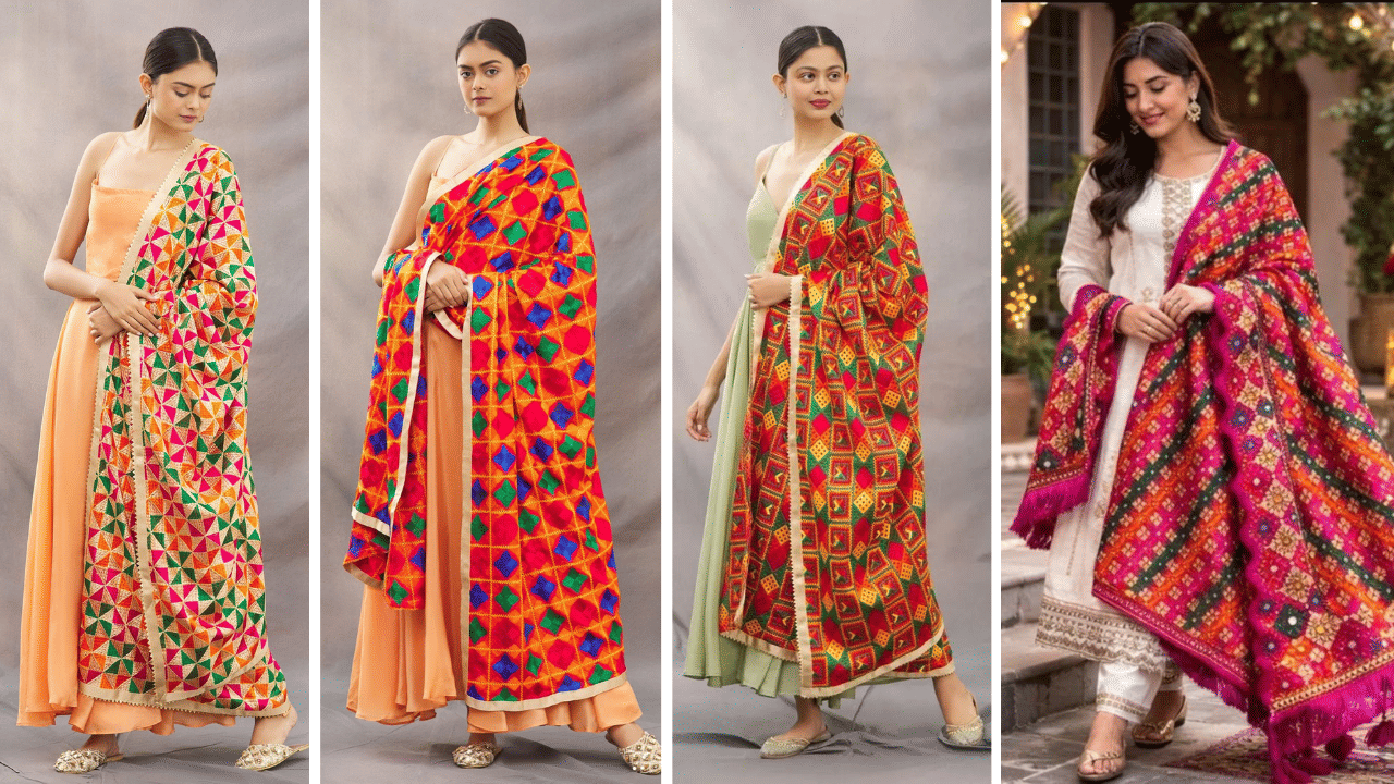 Nothing says Punjabi tradition like a bright, phulkari-embroidered salwar kameez. These suits, often crafted in vivid hues like mustard, orange, or pink, feature detailed threadwork representing Punjab’s heritage.
