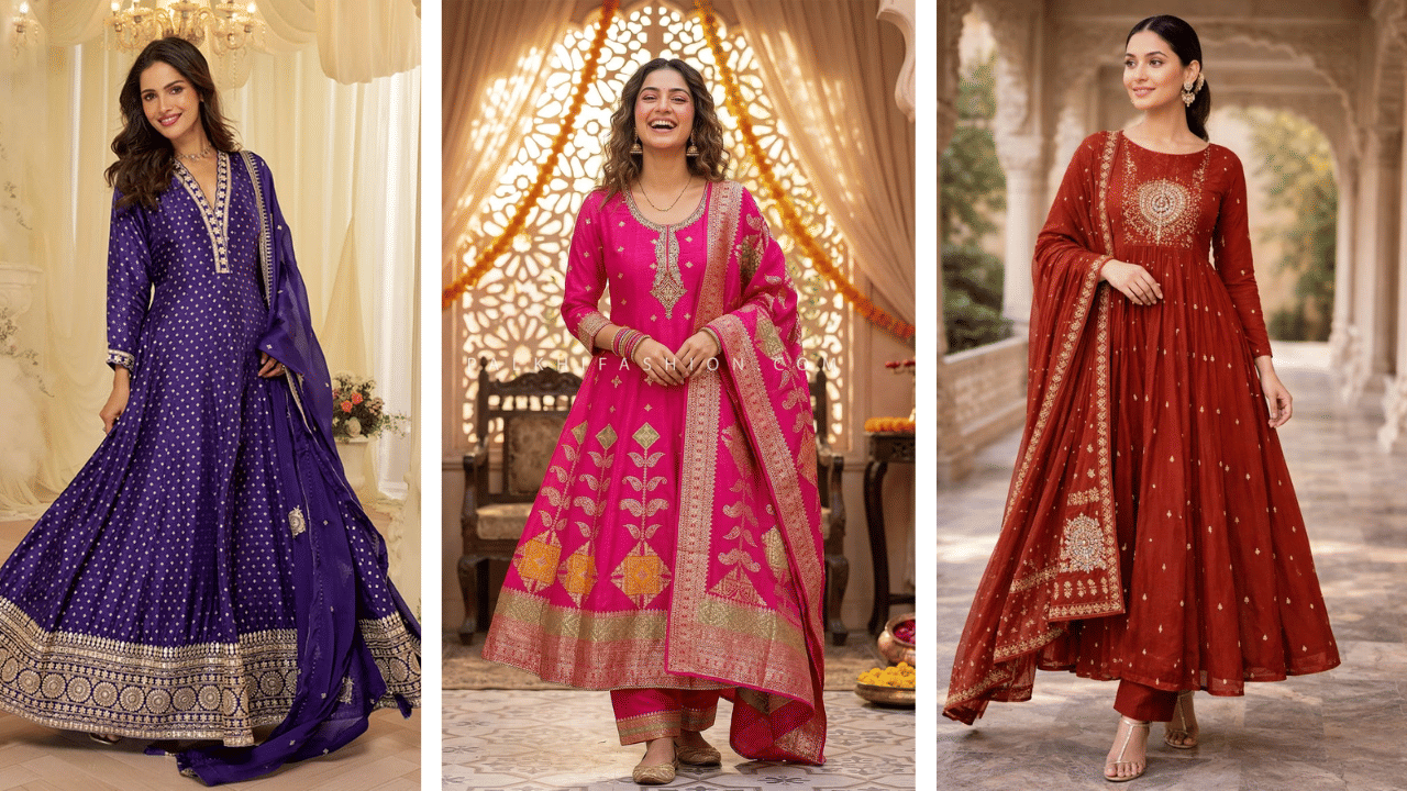 A regal silk Anarkali with intricate zari embroidery exudes festive charm. The flared silhouette enhances the traditional aesthetic while maintaining a luxurious vibe for evening events.