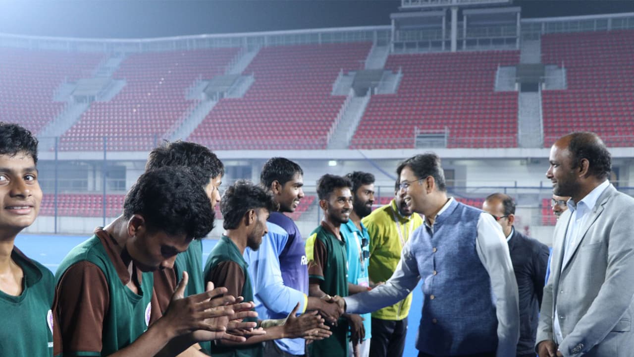 Ajeet Kumar Shrivastava, Commissioner, National Education Society for Tribal Students (NESTS), attended the Boys’ Hockey Final of the 4th National EMRS Sports Meet 2025 at the International Birsa Munda Hockey Stadium, Rourkela. Vipin Kumar, Joint Commissioner, and Rashmi Chaudhary, Assistant Commissioner, NESTS, were also present during the final match.
