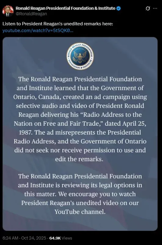 The Ronald Reagan Presidential Foundation and Institute, in a post on X, said the ad misrepresents a presidential radio address Reagan delivered in April 1987 and that his remarks were edited without its permission. The entity added that it was “reviewing its legal options in this matter.”