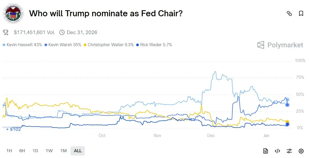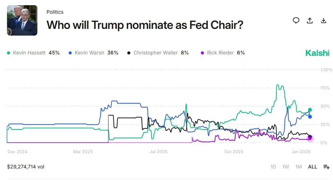 Hassett currently remains at the top of the charts on both Kalshi and Polymarket, Warsh is second, followed by Waller and Rieder in the third and fourth positions, respectively.