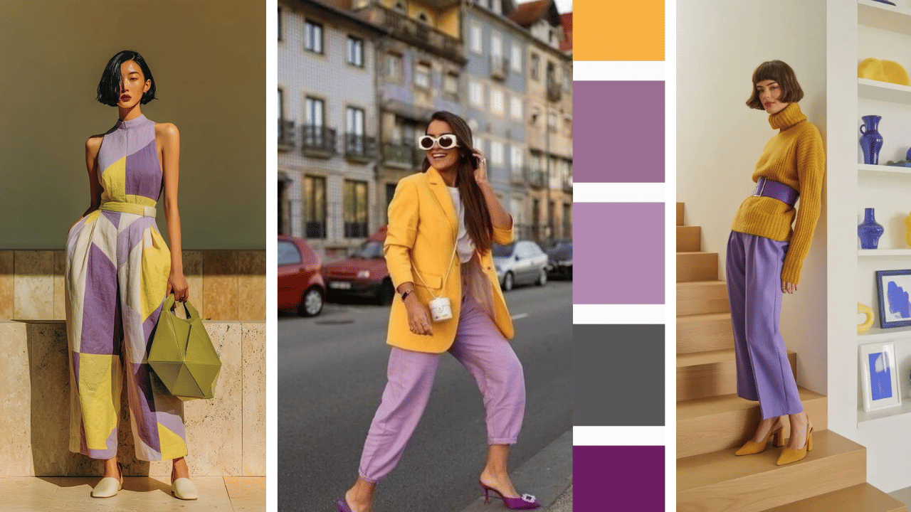 Mustard’s warm, spicy yellow grounds lavender’s cool, hazy purple, blending retro spice with modern calm for a fresh, vintage-inspired pop that’s effortlessly cool. Try mustard yellow culottes with a lavender shirt tucked in, plus strappy sandals for summer lunches, or a lavender dress layered with a mustard cardigan and white trainers for casual strolls—gold chains tie it together seamlessly.