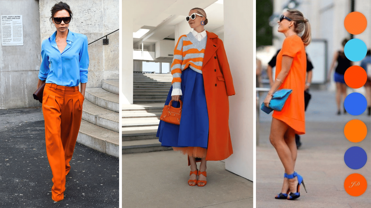 Orange’s fiery warmth dances with blue’s serene cool (think burnt tangerine against navy), mimicking sky-fire drama for high-impact contrast that’s surprisingly wearable and energising. Rock an orange blouse with blue jeans and espadrilles for markets, or a blue shirt dress with orange block heels and a tan belt for evenings—neutral bag prevents overload.
