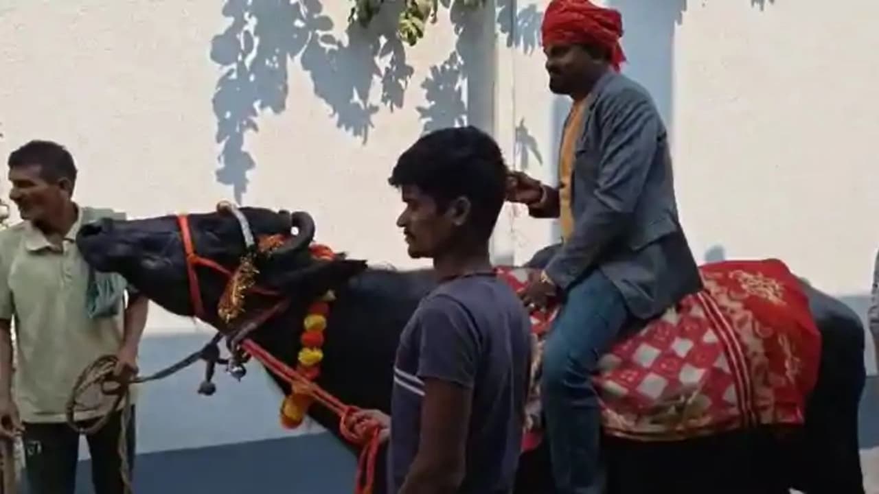 Unique picture of Bihar elections: Farmer rides on buffalo to cast his vote