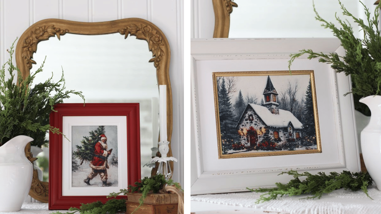 Pick up cheap frames from thrift stores and turn them into instant Christmas wall decor. Print vintage Christmas illustrations, tartan patterns or minimalist typography and pop them into the frames. Style a small gallery wall behind your sofa or desk for an elevated backdrop in reels.