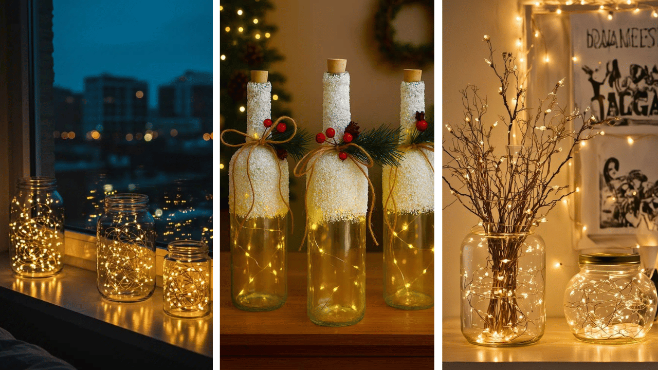 Skip random string lights and create “glow clusters” on consoles or coffee tables. Layer warm LED fairy lights inside glass jars, cloches or unused vases for soft, high-end hotel-style lighting. Group three different heights together to get that gentle, designer-style holiday glow.