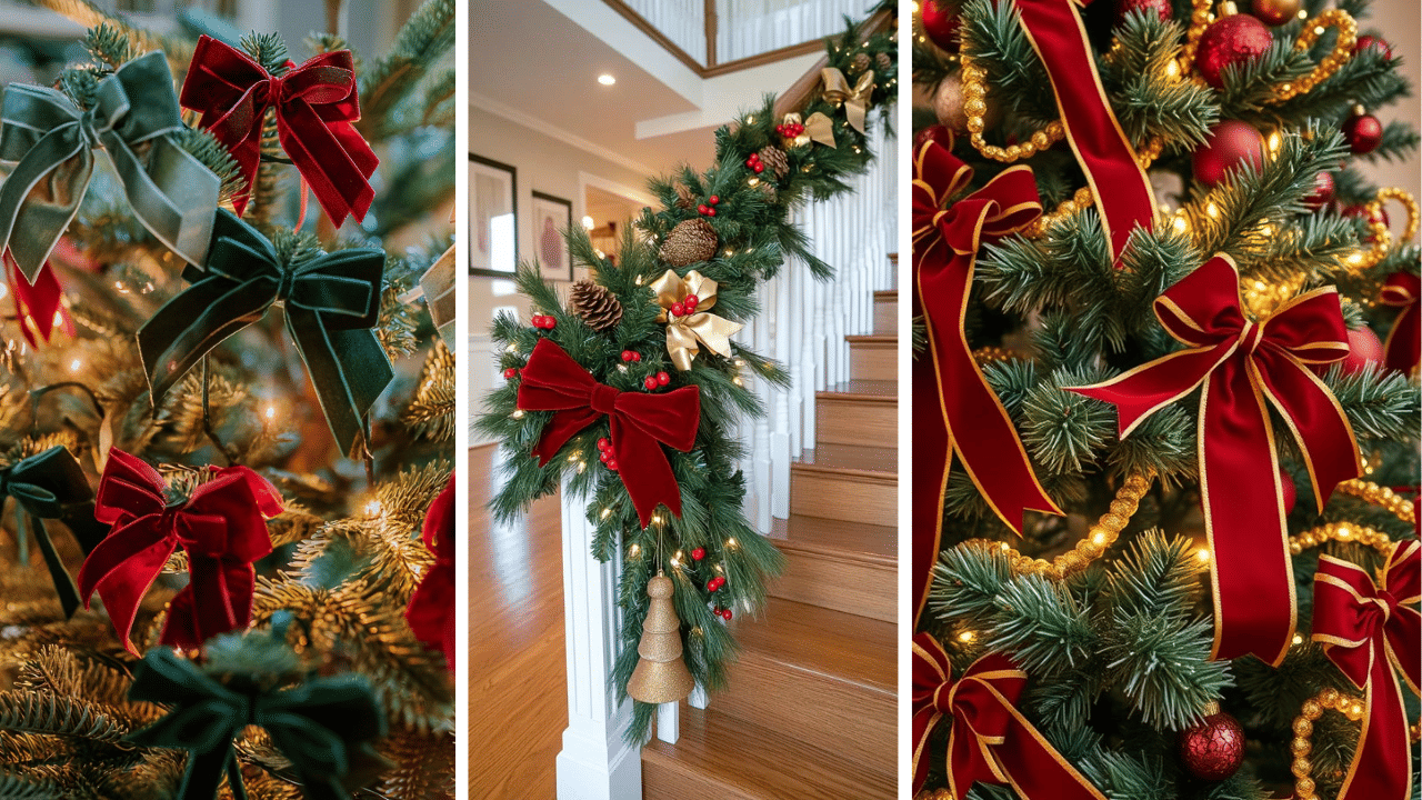 Velvet bows are a massive Christmas 2025 decor trend and instantly elevate basic pieces. Tie slim velvet ribbons around curtain rods, lamp necks, chair backs and even cupboard handles. Stick to one or two colours, like deep green and burgundy, for a polished Ralph Lauren Christmas aesthetic.​