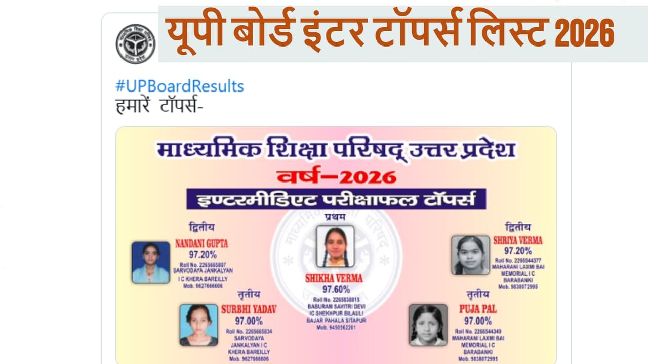 UP Board Inter Topper List 2026: UP Board 10th and 12th Result 2026 has been released. Along with this, Inter Toppers list has also been released. Shikha Verma has topped with 97.60%. See complete toppers list, result update and what reward the toppers will get.