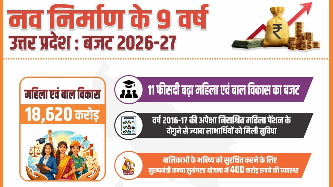 In the UP Budget 2026-27, a provision of Rs 18,620 crore has been made in the Women and Child Development Budget by 11%. Special focus has been given to destitute women pension, Kanya Sumangala Yojana, women hostel construction and child protection schemes.