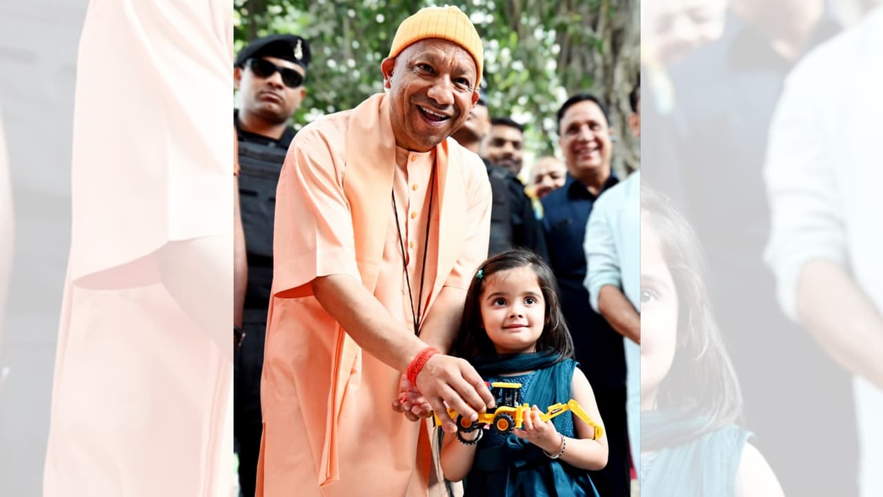 4 year old girl Yashaswini gifted a small bulldozer to Chief Minister Yogi Adityanath at Gorakhnath temple. The Chief Minister smiled after seeing the innocence and surprise of the girl. This moment became special for everyone present there.