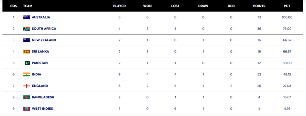 Australia continue to remain the no.1 team in the World Test Championship (WTC) 2025-27 rankings with a win PCT of 100. The Pat Cummins-led side has played six Test matches in the ongoing WTC cycle so far and have all matches to remain at the top spot on the points table.