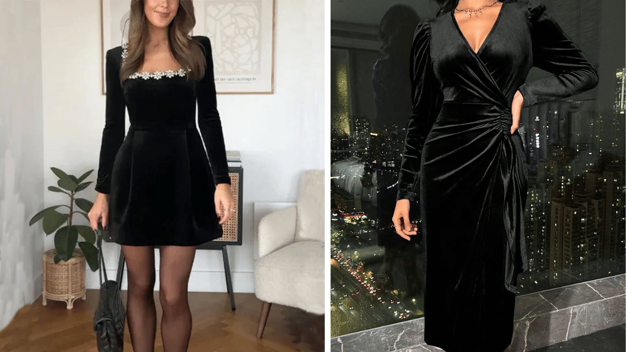 A black velvet dress feels luxurious and instantly festive. Choose solid black or deep navy for a sleek corporate vibe. Add silver earrings or a metallic clutch for subtle sparkle. This remains a top pick for elegant Christmas dresses for office parties.