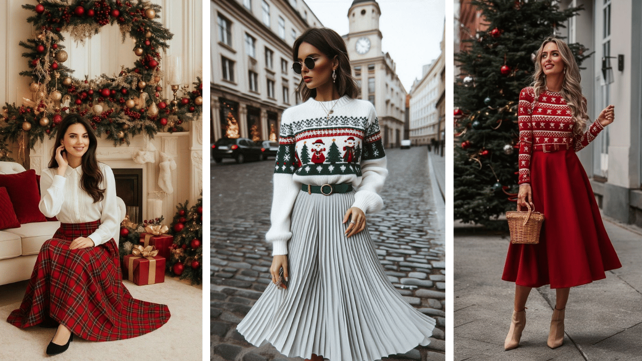 A pleated skirt in gold, rose gold, bronze, or forest green pairs beautifully with a fitted knit top in black, cream, or burgundy. This festive-meets-professional combination stands out in Christmas outfits for women across workplaces.