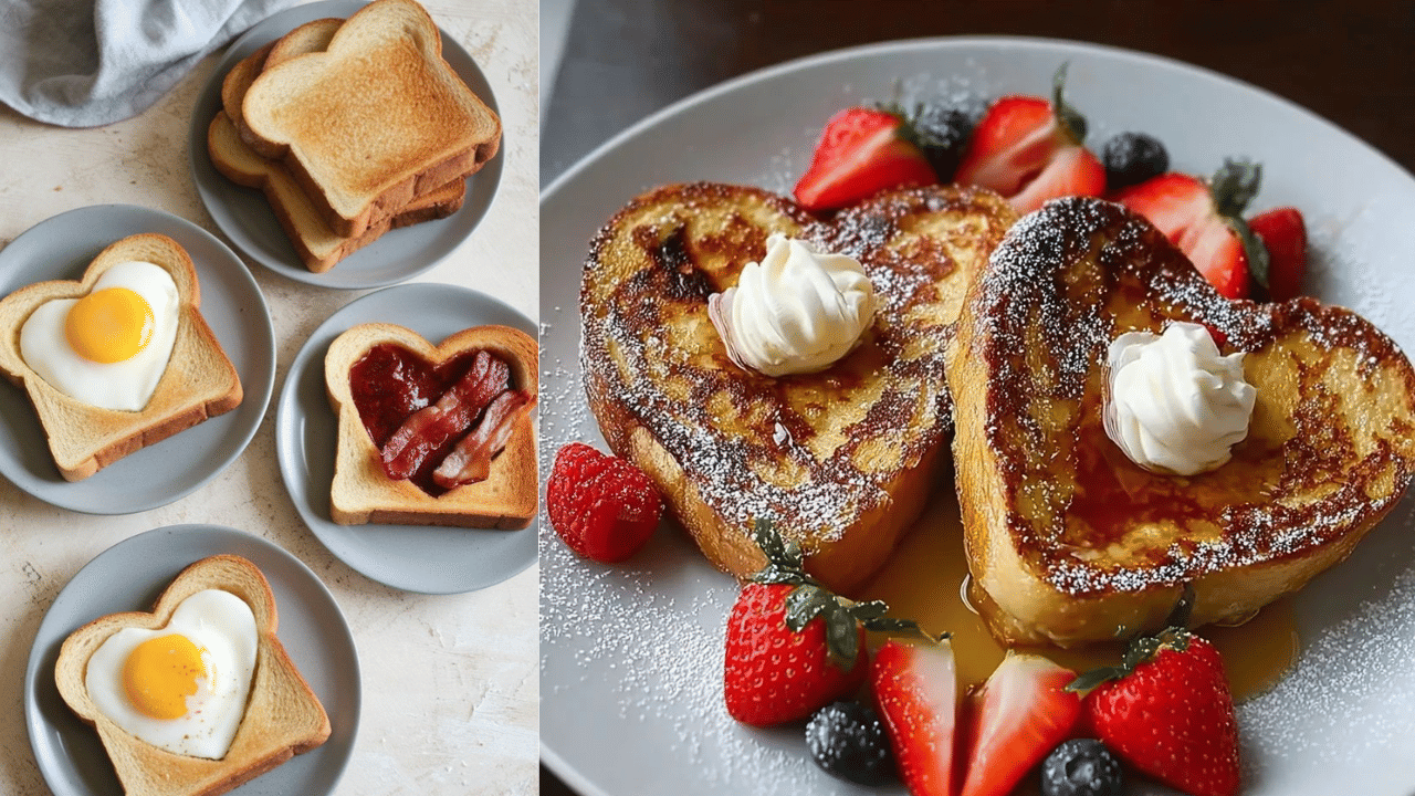 Quick Recipe: Cut hearts from thick bread slices with a cutter. Whisk 3 eggs, 240ml milk, 1 tsp cinnamon, vanilla, and a pinch of salt. Dip hearts for 30 seconds on each side. Fry in butter over medium heat 2-3 minutes per side till golden. Dust with sugar, add berries. Serves 2 in 20 minutes.