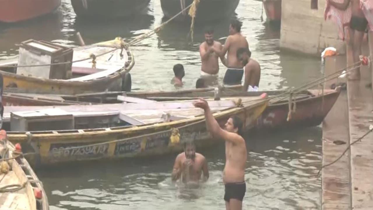 Devotees in Varanasi braved the biting cold on Sunday morning to take a holy dip in the Ganga River, as the city continues to experience low temperatures amid a persistent cold wave. Devotees were seen immersing themselves in the Ganga and offering prayers at Dashashwamedh Ghat despite the early morning chill.