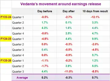 Let’s examine how Vedanta has reacted to its quarterly earnings announcements over the years to gain insights into its price movements.