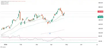 In the near term, ₹750-₹760 acts as immediate resistance, while ₹700-₹720 remains a strong support band. A decisive move above resistance could resume the uptrend toward recent highs, whereas a breakdown below the 20-day EMA may lead to a deeper retracement toward the 50-day average.