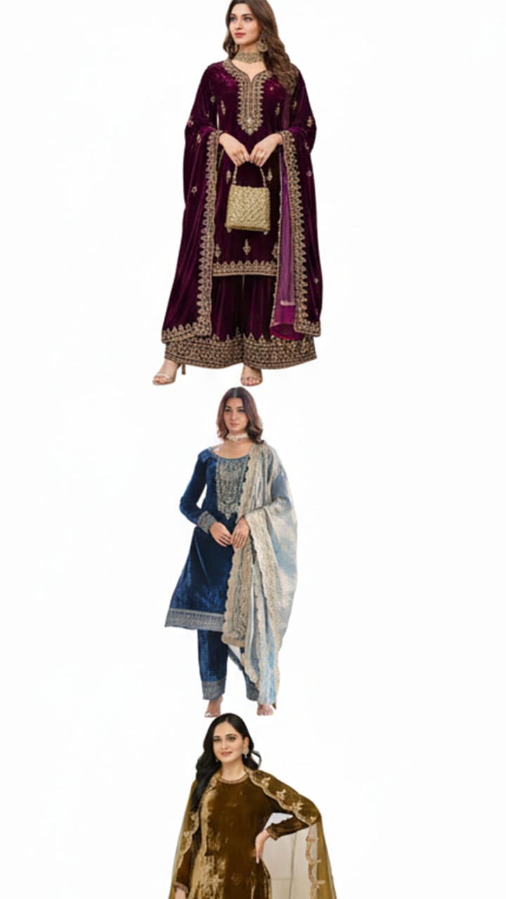 If you are looking for a heavy velvet suit, then choose this rust green colored embroidered Sharara kurta. Which has border work sharara and organza chunni.