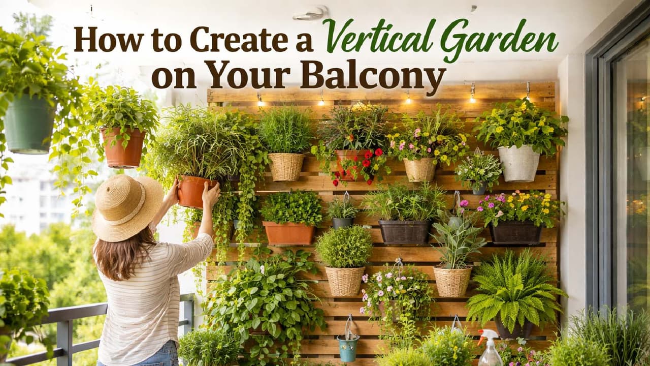 To create a vertical garden on your balcony, first choose a perfect wall or railing. Attach sturdy hooks or stands to the chosen surface and hang small pots on them. You can plant varieties like money plants, spider plants, or herbs – these are species that are easy to grow and don’t require much care. Additionally, you can also create a DIY garden by reusing old bottles or crates.