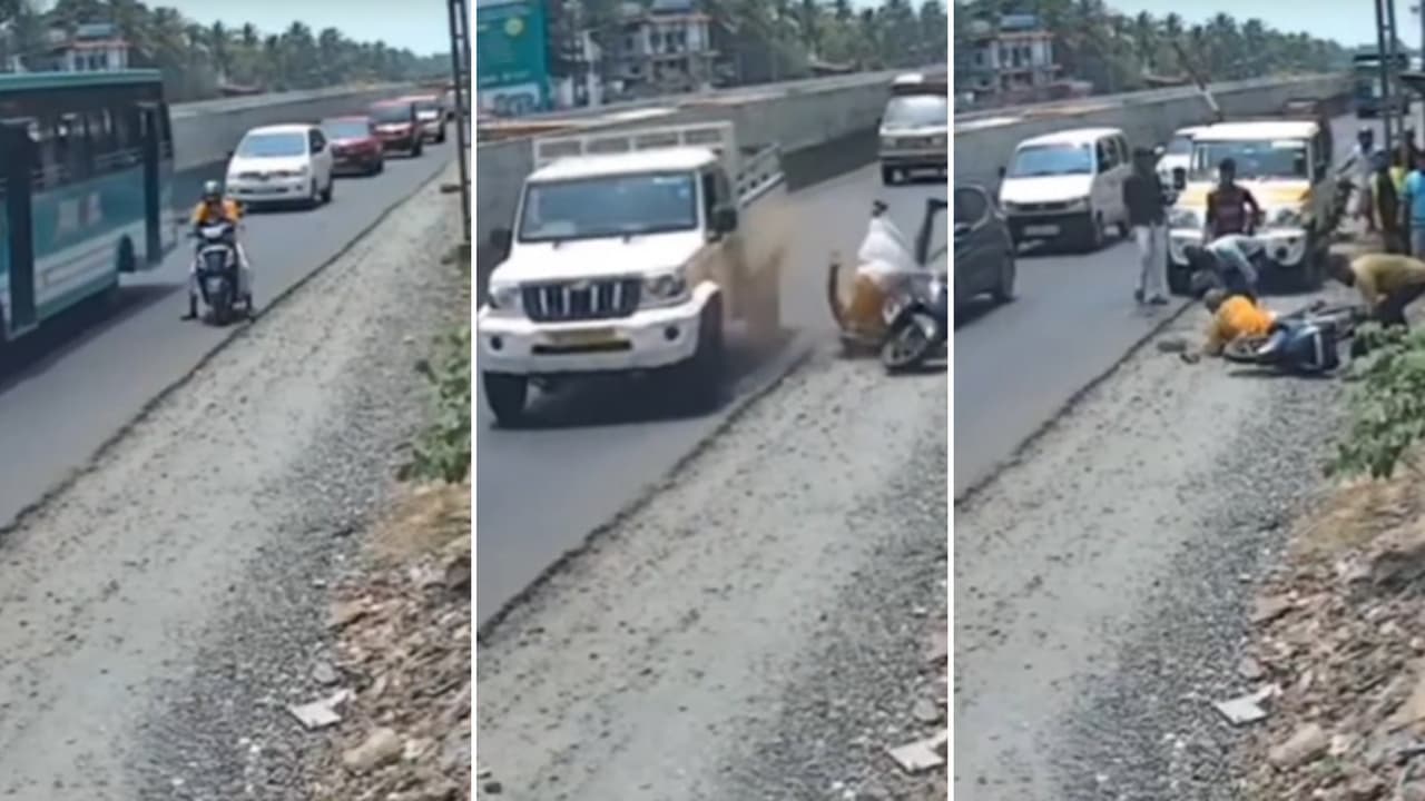 A viral video from Koyilandy in Kerala shows a scooty rider being hit by a Mahindra pickup truck while talking on his phone. The man had stopped his scooter on the road instead of moving fully to the side. He was wearing helmet and escaped serious injury. The clip has sparked a heated online debate, with many blaming the rider for blocking traffic.