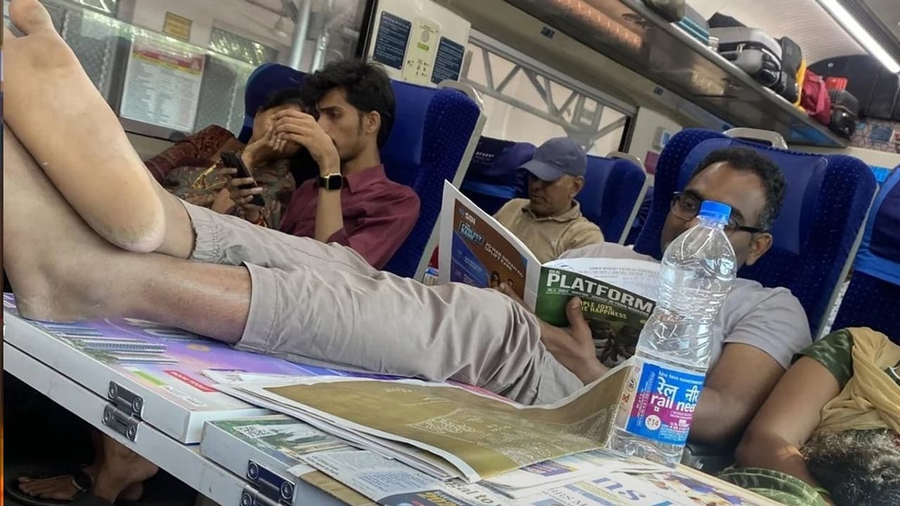 A photo of a man resting his bare feet on a tray table aboard a Vande Bharat Express has sparked criticism for his lack of civic sense and cleanliness. Kohina, an X user, uploaded a photograph of a man reading a book with his feet resting on a folding tray table designed for food service. An Indian Railways passenger initially shared the image on Reddit, describing the behaviour as “honestly infuriating”.