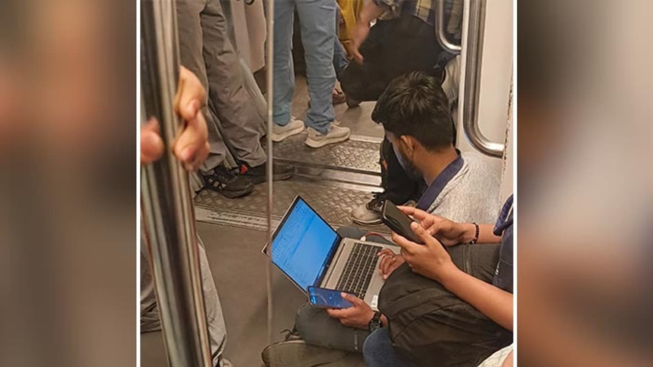 A photo of a man working on his laptop on the Delhi metro floor went viral after he reportedly received a call from his boss. The image sparked a widespread online debate about the state of work-life balance and toxic work culture in India’s corporate sector, with netizens sharing divided opinions.
