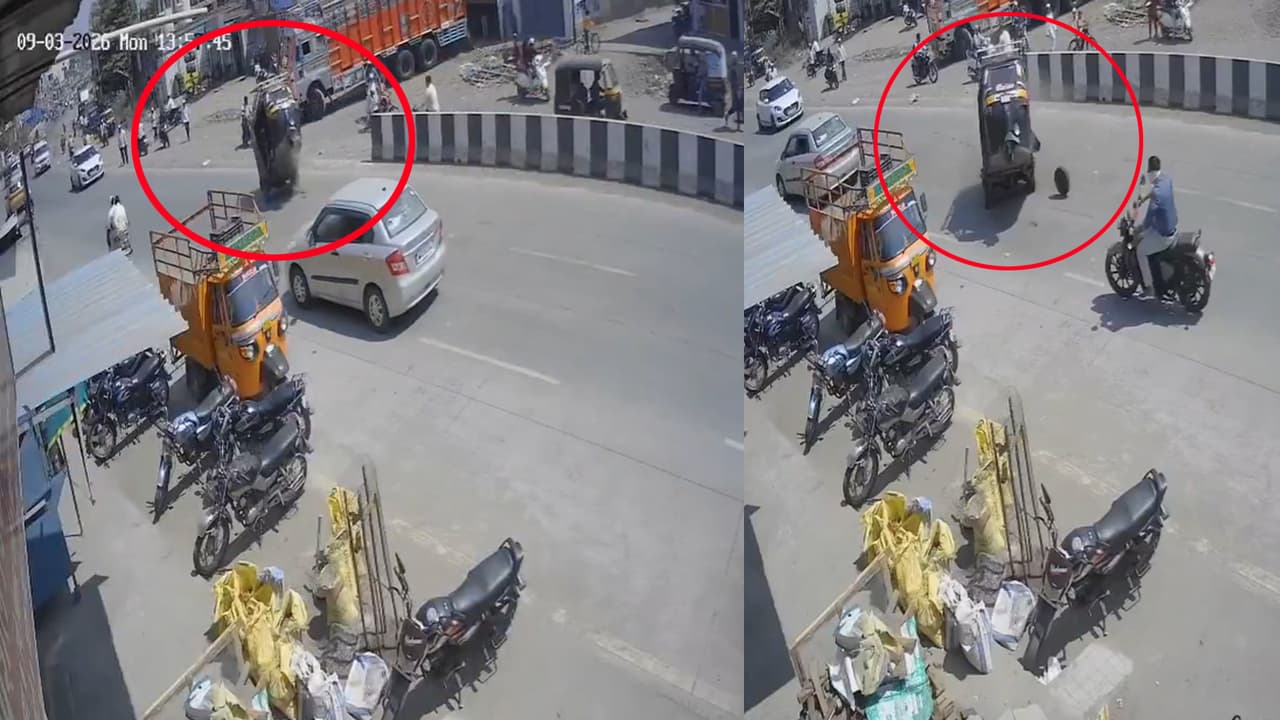 A video of a dangerous road accident has surfaced in Ahilyanagar in Beed district of Maharashtra. When the wheel of the speeding auto rickshaw came off, it jumped in the air and collided with the bike coming from the front. The bike rider and the people sitting in the auto were injured in the accident.