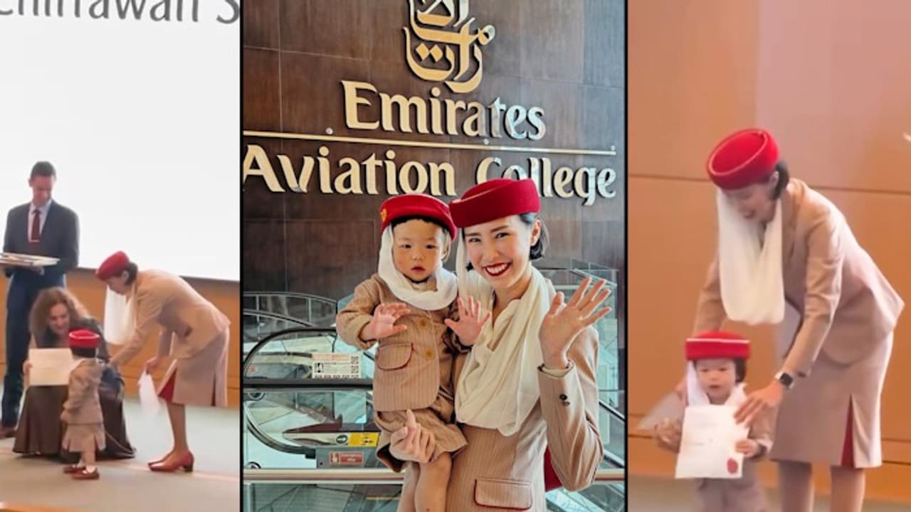 An Emirates flight attendant, Chittawan Sukaphat, made her graduation memorable by bringing her daughter on stage in a matching uniform. The viral video captures the heartwarming moment the little girl also receives a certificate, a scene celebrated online as a symbol of personal and professional achievement.