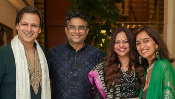 The first image captures Vivek Oberoi performing puja with his wife, Priyanka Alva Oberoi. In the next, he is seen posing alongside R. Madhavan and his wife, Sarita Birje. Another photo features Vivek and Priyanka striking a pose with television actress Roshni Chopra, while a candid shot shows Vivek and Madhavan sharing a hearty laugh. The ‘Prince’ actor also shared several heartwarming moments with his family members, completing the festive celebration.