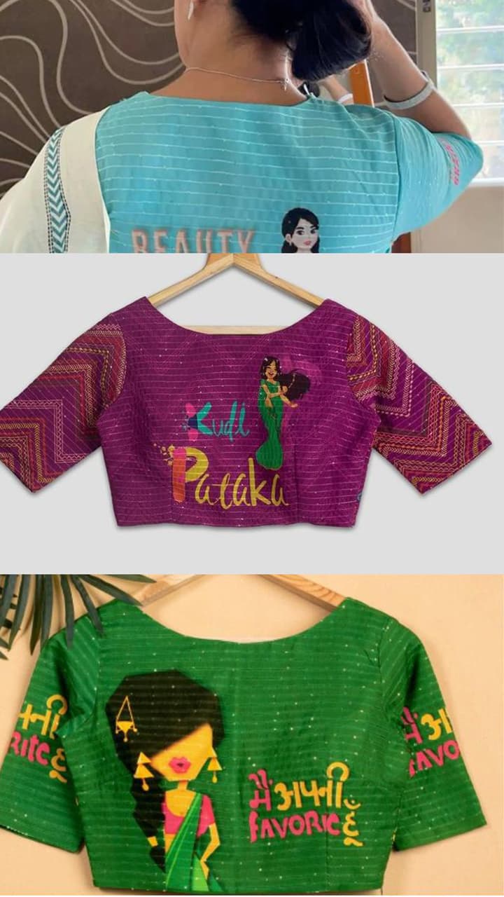 Wear this type of green colored blouse on plain green, white, red colored saree. In which it is written I am my favorite or you can also choose a blouse with Kudi Patakha like this.