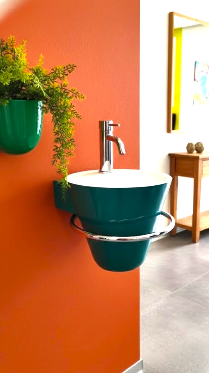 If there is less space in the hall then you can choose this type of vanity wash basin, which comes with a long mirror. It has a stone finish circular basin, which comes with LED light. Such design is in trend.