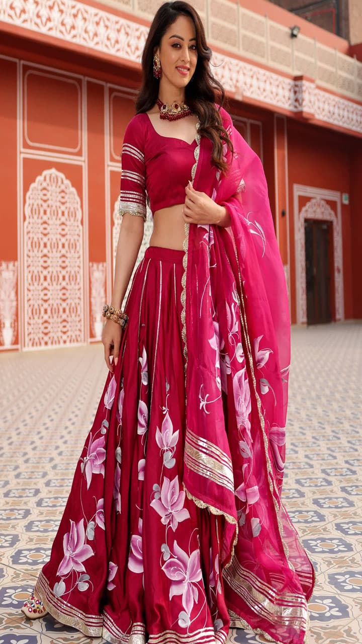 Pink lotus print on green colored lehenga looks gorgeous. Gotapatti detailing is given on the lehenga. You can wear this on Makar Sankranti for a fresh look.