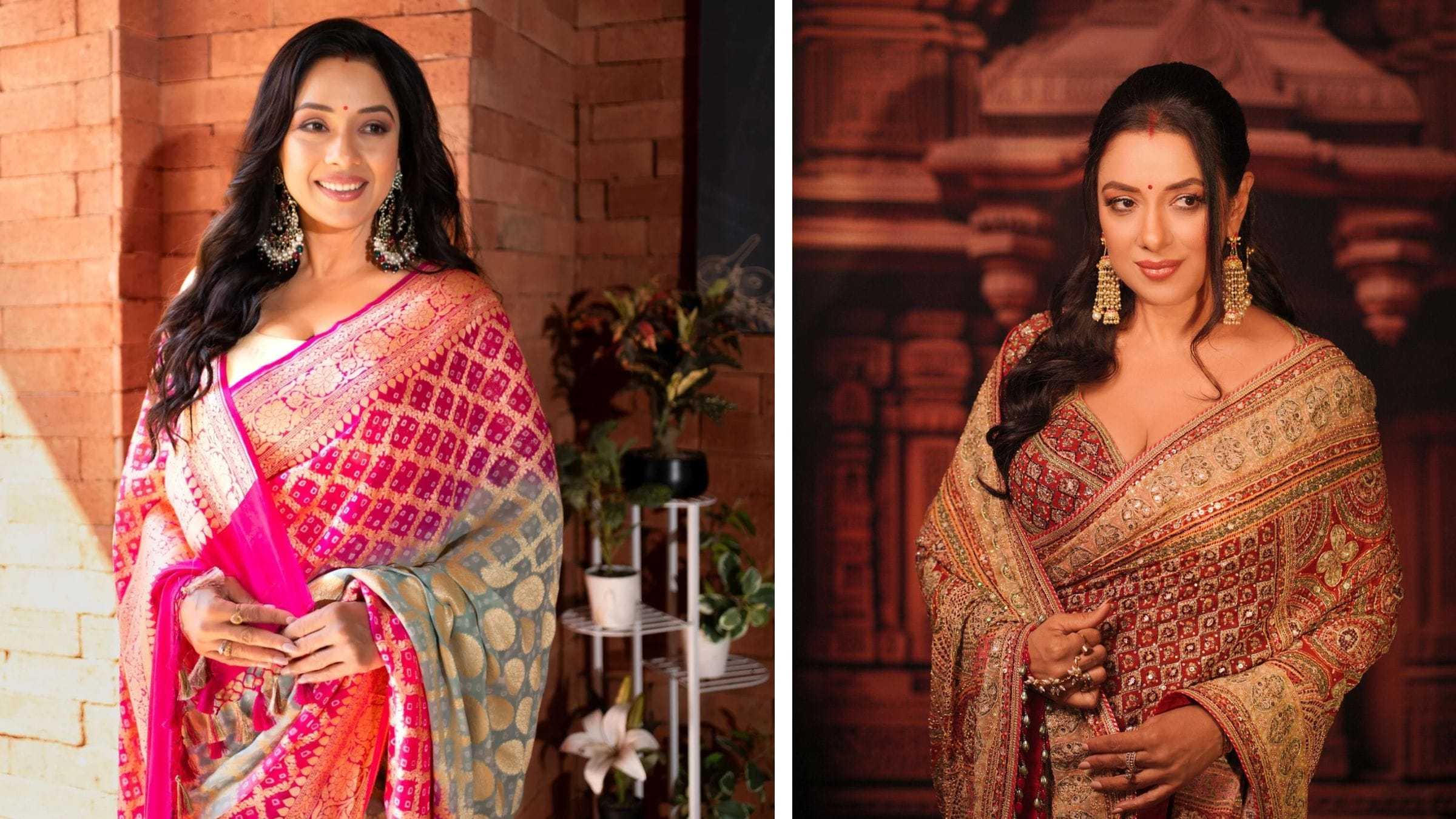 This look of TV’s Anumpa i.e. Rupali Ganguly is a good option for Makar Sankranti. The actress is wearing a golden colored saree, paired with a matching blouse. At the same time, the red colored dupatta has been carried on one side. Rupali has completed her look with a bun and heavy necklace.