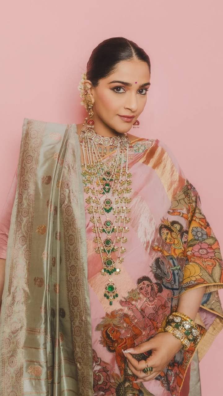 Sonam Kapoor flaunted her baby bump in a 6 meter long pistachio and pink Kalamkari saree. If you want to look tall, you can wear saree.