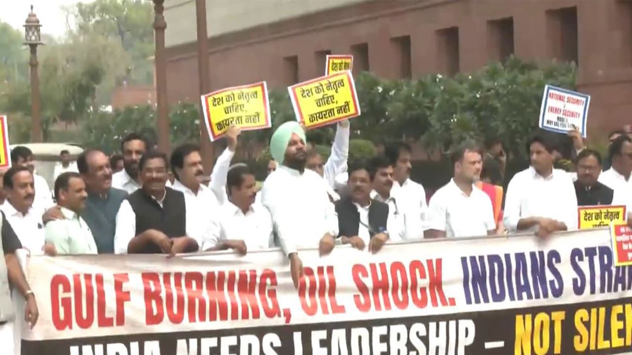 Leader of Opposition in Lok Sabha, Rahul Gandhi and LoP in Rajya Sabha, Mallikarjun Kharge, were also among the MPs protesting outside Parliament. The leaders held a banner reading, “Gulf burning, oil shock. Indians stranded. India needs leadership- no silence.”