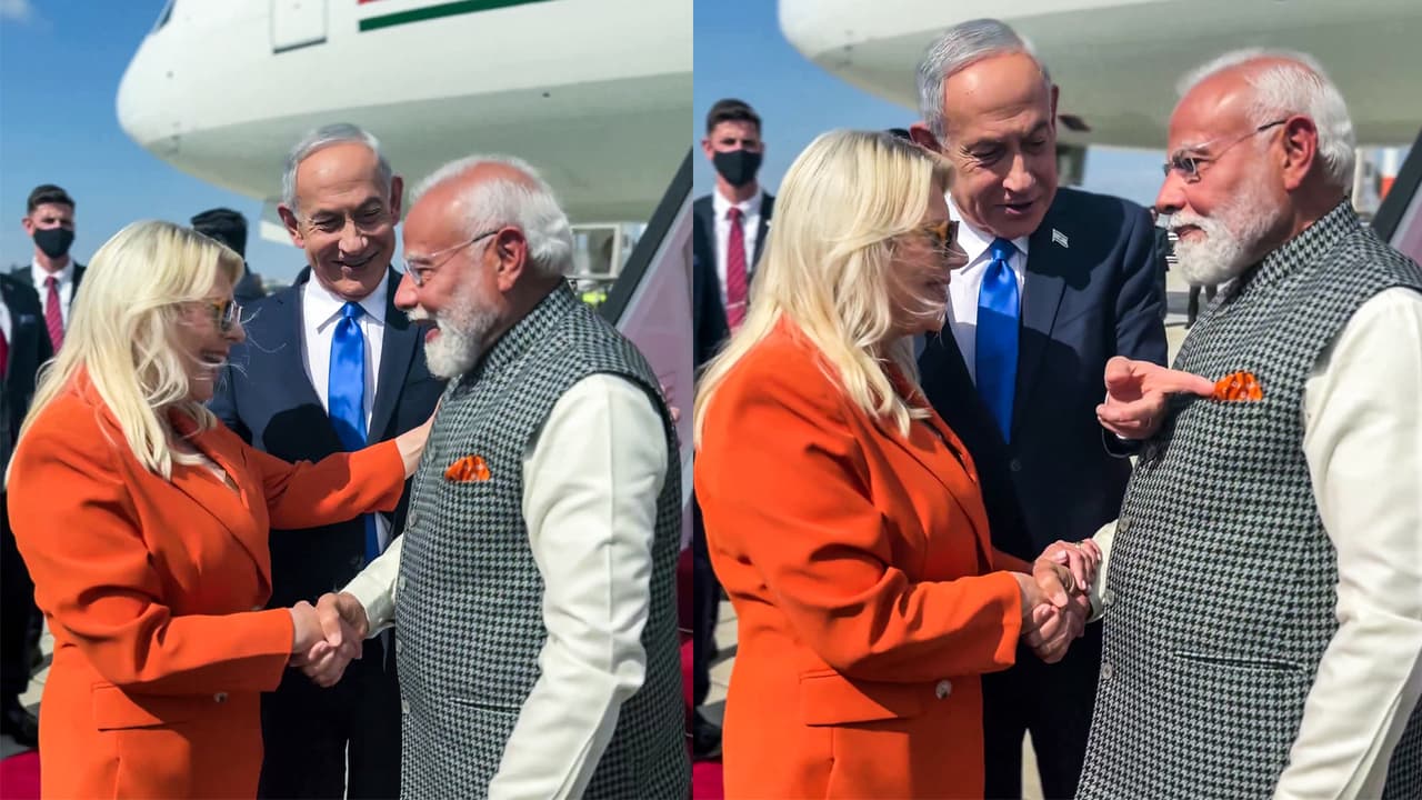 Prime Minister Narendra Modi received a grand welcome at Ben Gurion Airport upon his arrival in Israel. PM Benjamin Netanyahu and Sara Netanyahu broke protocol and welcomed him. A light-hearted moment on saffron color is going viral on social media.